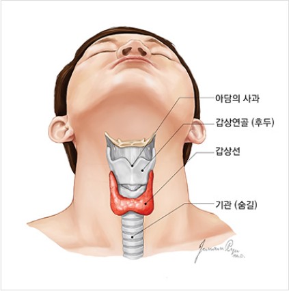 갑상선은 목 앞쪽 후두가 위치한 곳의 아래에 위치한 내분비기관으로서 갑상선호르몬을 생산하는 공장입니다. 갑상선 호르몬은 몸의 신진대사를 조절하고 열과 에너지를 만드는 인체의 보일러의 역할을 수행합니다.