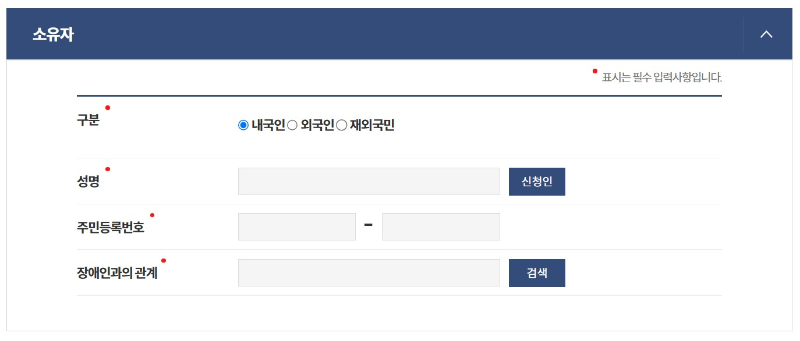 장애인의 개인정보를 입력합니다. 장애인 본인이 신청하는 경우 [신청인]을 누르시면 이름과 주민번호가 자동으로 등록됩니다.