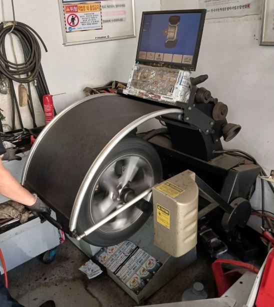자 일단 바퀴를 빼서 기계에 넣고 돌려줍니다~그럼 기계가 휠의 무게중심을 파악해 줌. 기계 사용법만 알면 쉬울 듯? 하지만 남이 하는 건 원래 쉬워 보이고 쉽게 쉽게 하는 것처럼 보이는 사람은 만렙이라는 사실을 기억하자.