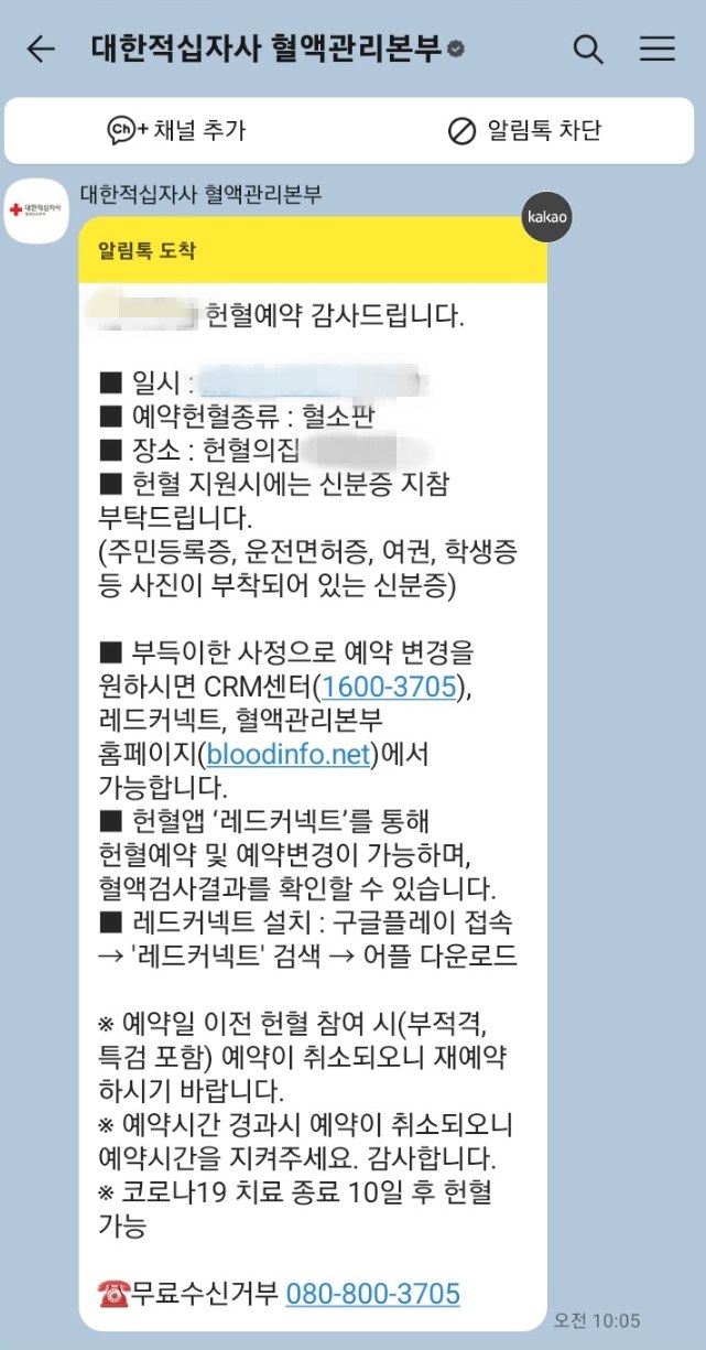 예약을 마치면 카톡으로 메시지가 옵니다. 전화하는 게 불편하다면 레드커넥트 앱으로 편하게 예약, 검사결과, 진행상황을 확인할 수 있습니다.